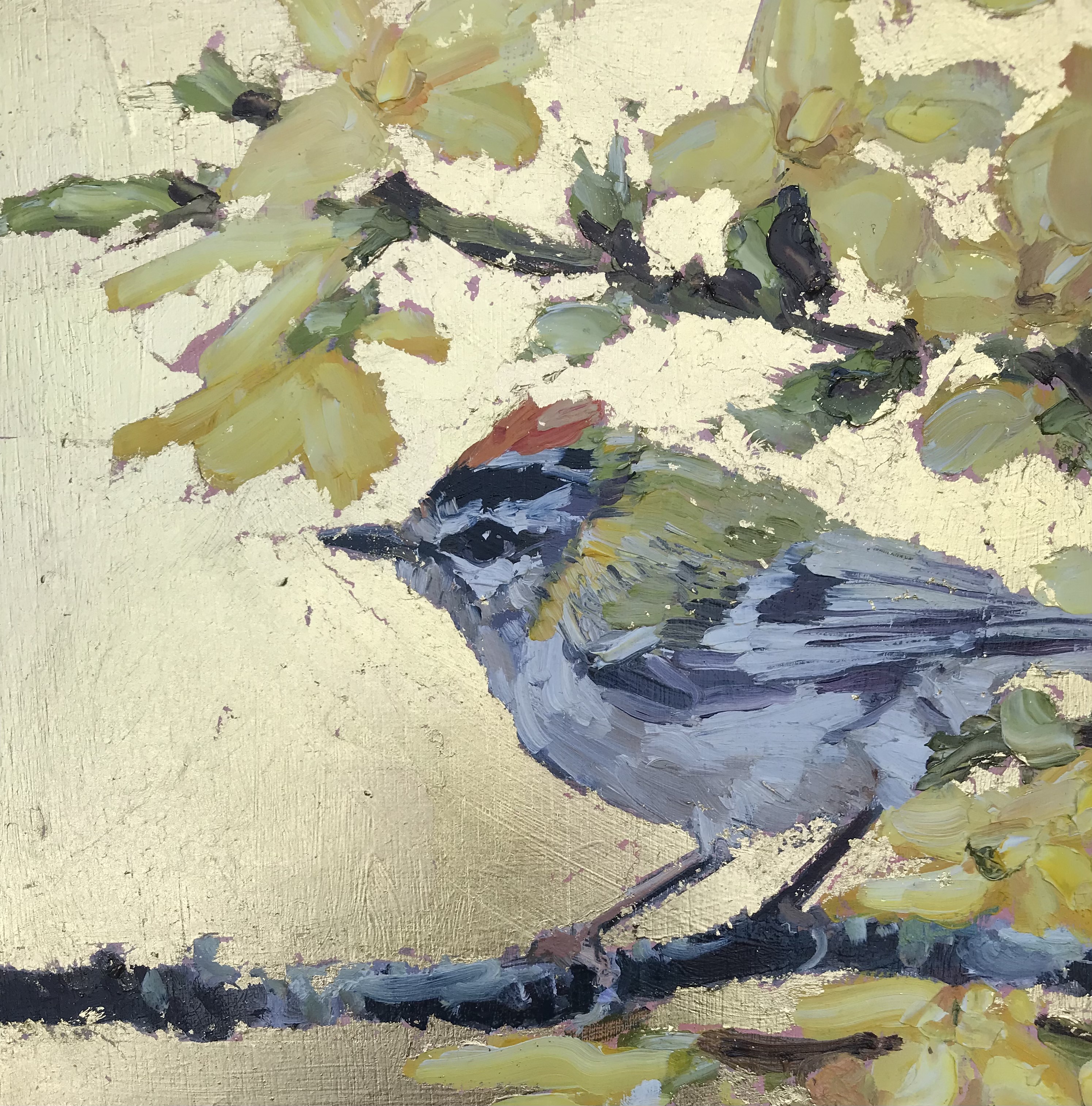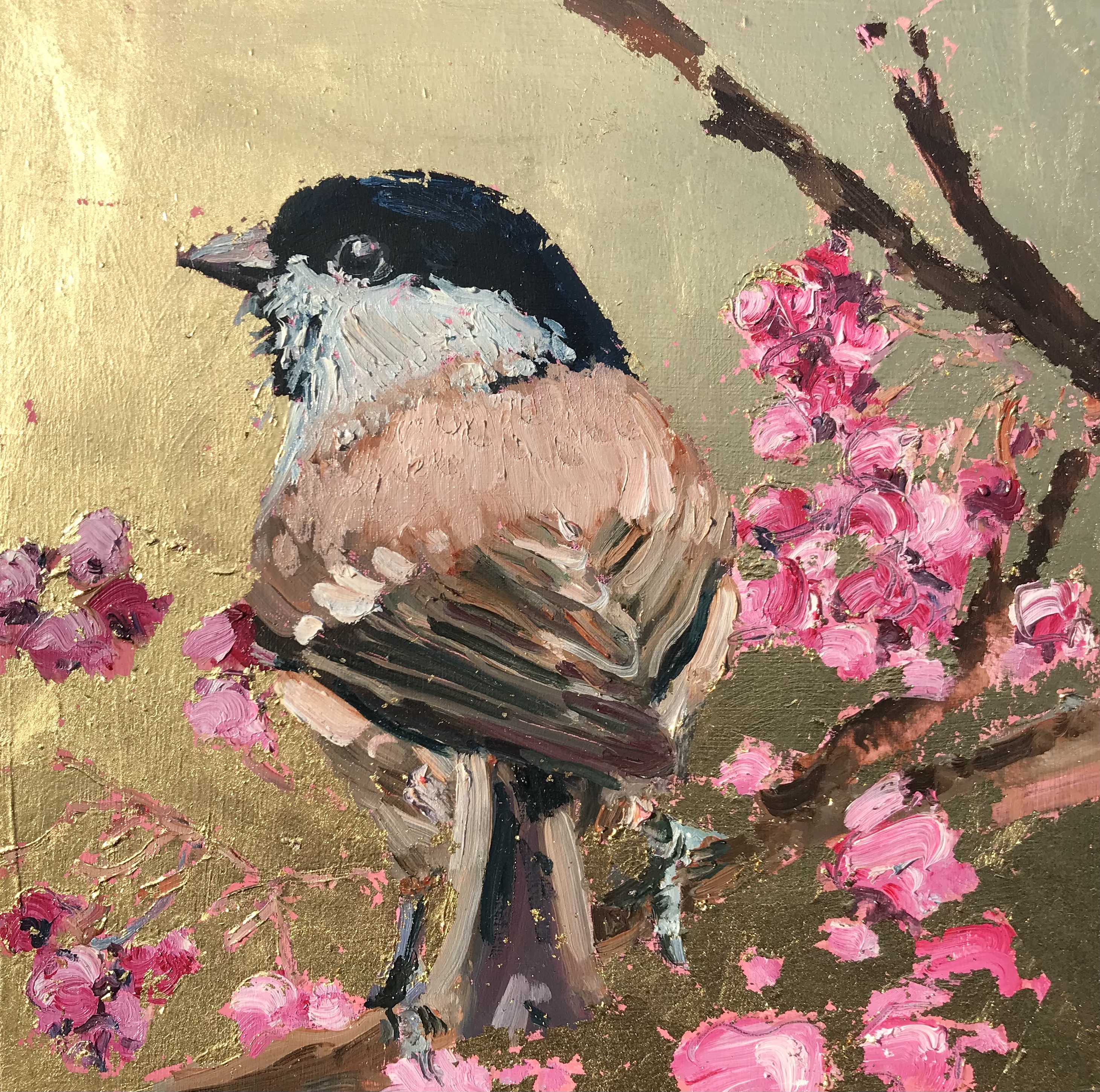 ‘All the blues’ 20cm x 20cm oil and 23 carat gold on board‘Bullfinch’ – 20cm x 20cm oil and 23 carat gold leaf on boardCoal tit, gold and pink – 20cm x 20cm oil and 23 carat gold on board‘In the yellow’ (Firecrest) – 20cm x 20cm oil and 23carat gold leaf on board