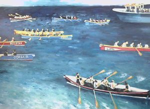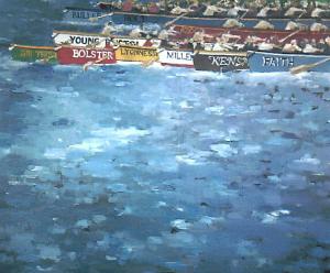 It was a great weekend – with the competition for places hard fought in all the heats, not just those at the top.  I’m back with a sore throat from singing, sore hands from rowing (but with bottom luckily more or less intact) . Over the next few weeks I will be posting new gig rowing art from the championships, and trying to capture the colour and excitement – and hard work – of gig racing.