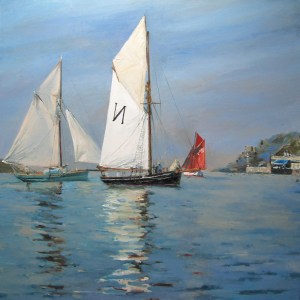 Every year the Pilot Cutter Review is held on a  May weekend in Cornwall.  Here are some of the boats hoisting sails, waiting for the race line to form. Mascotte is in the centre, one of the original Bristol Channel Pilot Cutters, with the distinctive N on her sail, for Newport. On the left is the beautiful Pilot Cutter Freya, newly built by Luke Powell and Working Sail, launched in April this year. In the background in full tan sail is the Westerman who took part in the racing.