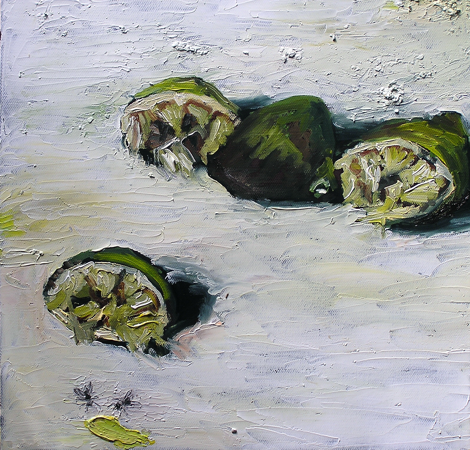Here I have tried to capture the feel of  lemons, not just their appearance. The intense, fresh, face-puckering citrus danger –  sharp feel, sharp flavour.  In this image though, all the energy has gone out of the fruit, the danger – passed. The colours have dulled, the focus soft. Two flies cautiously eye up the spent juice.
